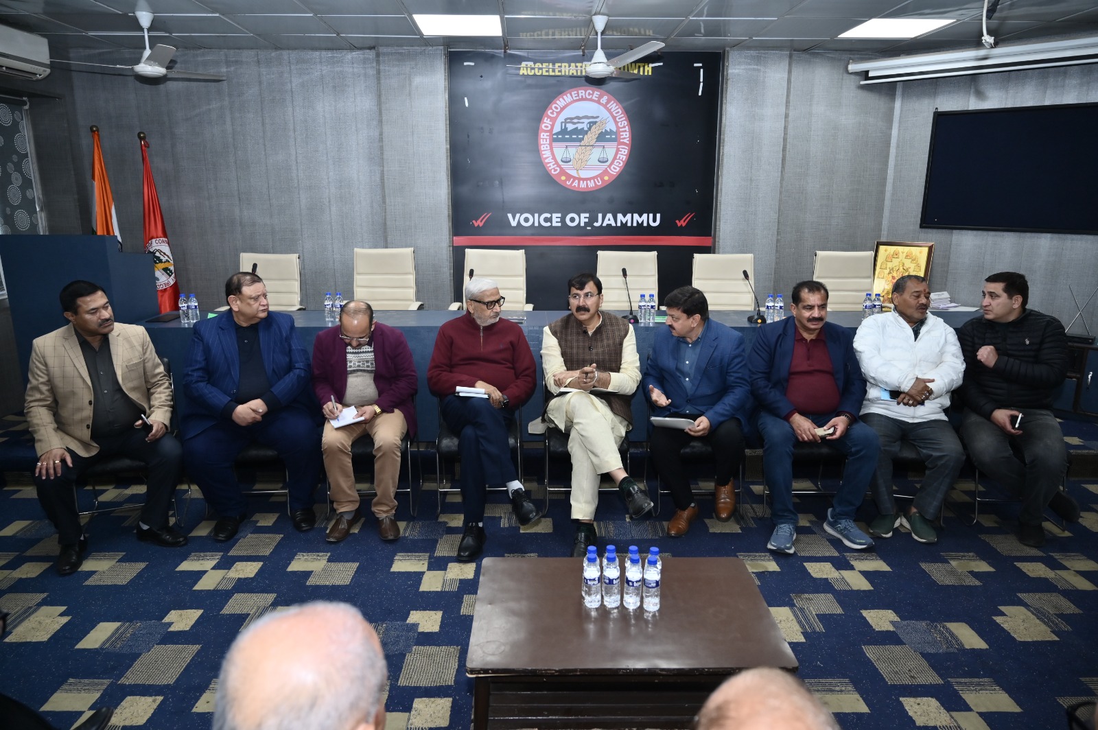 The others present in the meeting include Sh. Anil Gupta, Sr. Vice President CCI, Sh. Rajiv Gupta, Jr. Vice President CCI, Sh. Gaurav Gupta, Secretary-General CCI, Sh. Rajesh Gupta, Secretary CCI, Sh. Rajesh Gupta, Treasurer CCI, Sh. Sham Lal Kalsotra, President CCI Udhampur Sh. Romesh Chander Gupta, Ex-President CCI, Sh. Sham Lal Langer, Ex-Sr. Vice President CCI.